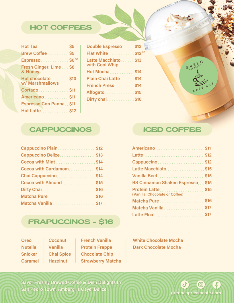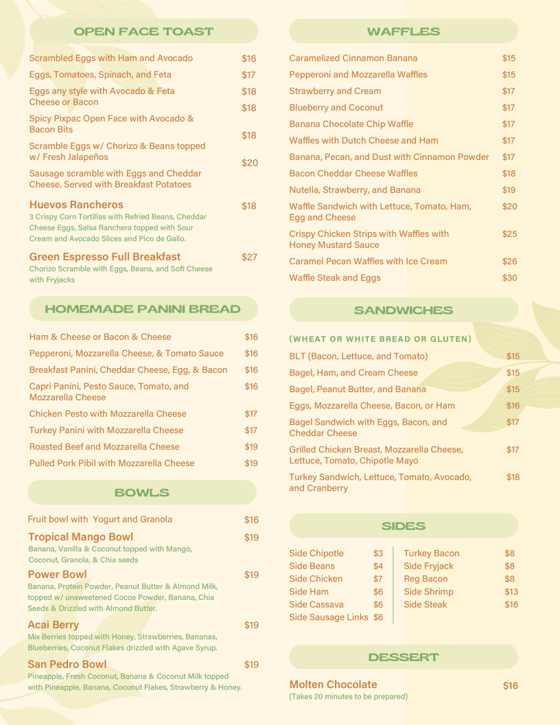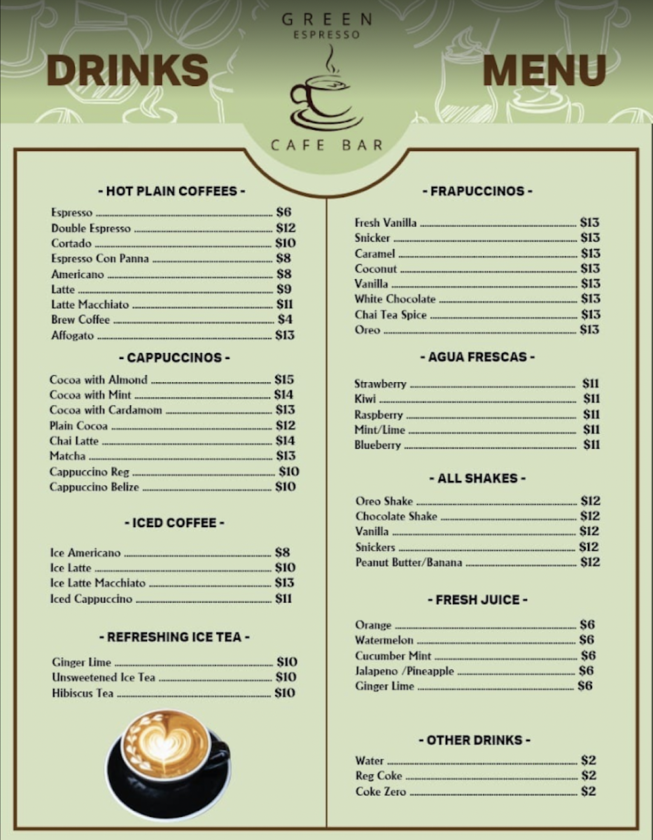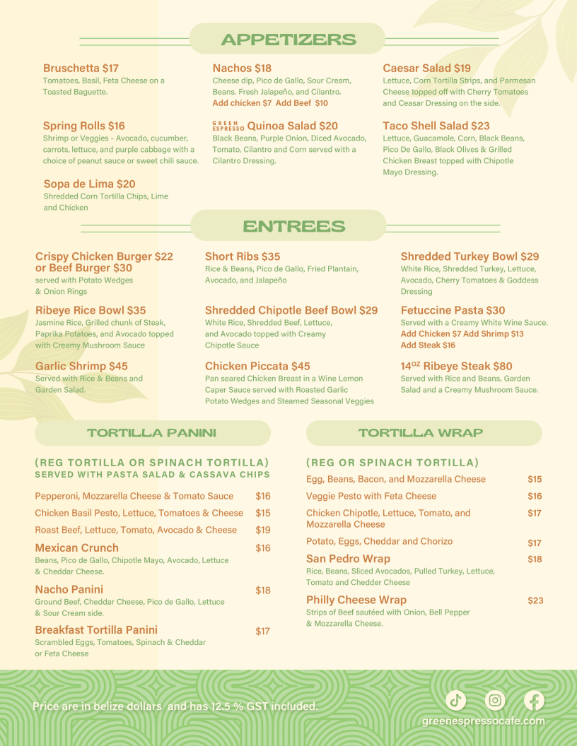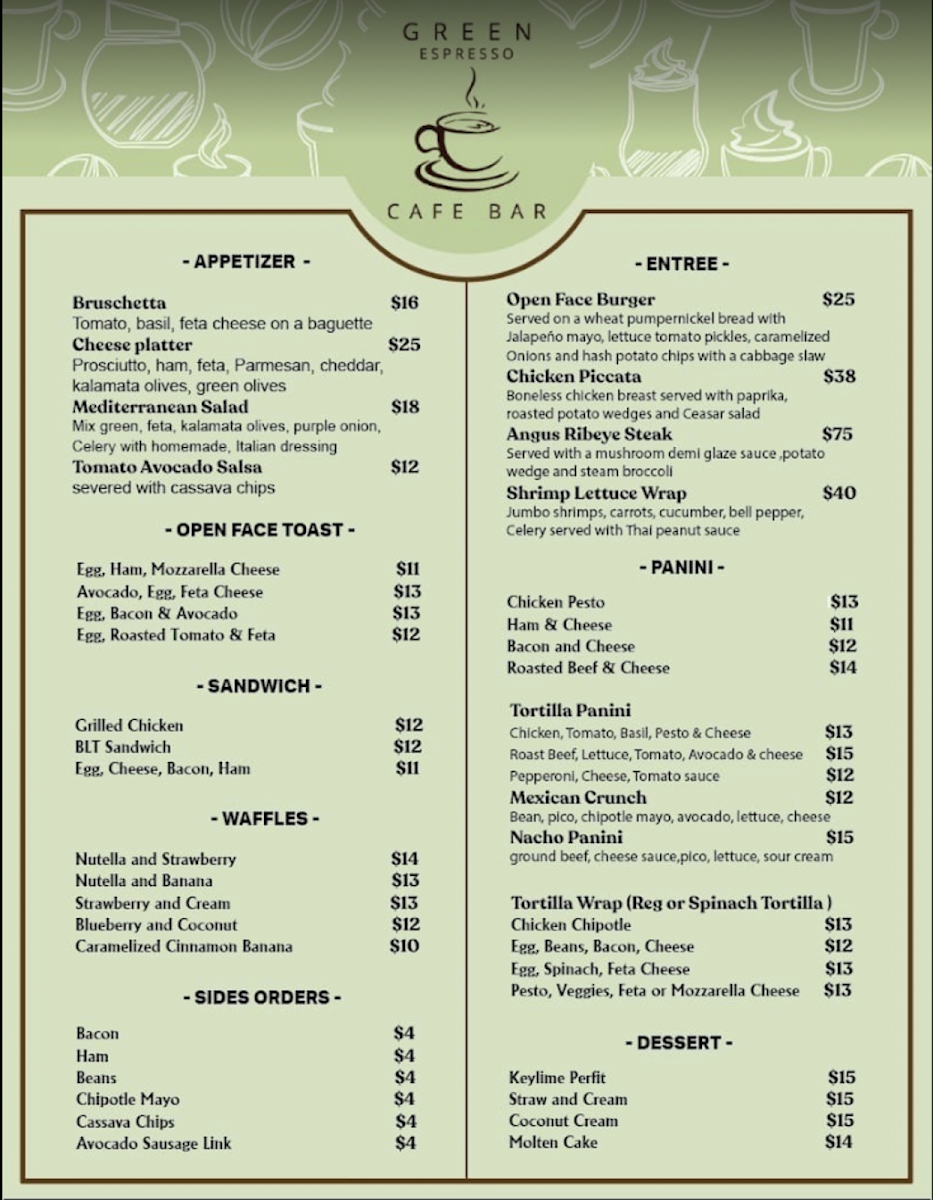 Green Espresso Cafe Bar offers a diverse and flavorful menu that caters to various tastes. For starters, you can enjoy Bruschetta or Spring Rolls, or dive into the tangy Sopa de Lima and Nachos. Their hearty entrees include the Crispy Chicken Burger and Beef Burger, as well as satisfying dishes like Ribeye Rice Bowl and Garlic Shrimp. For something more indulgent, try the Short Ribs. The menu also features an array of Tortilla Panini, such as the Pepperoni, Mozzarella Cheese & Tomato Sauce or the fresh Breakfast Tortilla Panini. If you prefer wraps, there are delicious options like the Chicken Basil Pesto or the flavorful Veggie Pesto with Feta Cheese. The open face toasts offer unique combinations, including Scrambled Eggs with Ham and Avocado and Spicy Pixpac Open Face with Avocado & Bacon Bits. For a sweet treat, the Caramelized Cinnamon Banana Waffles or the Blueberry and Coconut Waffle are excellent choices. The Homemade Panini Bread sandwiches, like the Ham & Cheese or Breakfast Panini, offer a satisfying meal. For lighter bites, enjoy a Tropical Mango Bowl or the refreshing Acai Berry Bowl. Don’t miss the indulgent Molten Chocolate for dessert. When it comes to drinks, the cafe serves a variety of Smoothies, like the Mixed Berries or the tropical Spinach, Banana, Pineapple & Orange Juice, alongside creamy Shakes such as Oreo and Snickers. There’s also a great selection of fresh juices, agua frescas, and refreshing Ice Tea options. Whether you’re in the mood for a chilled drink or a hot Cappuccino, Green Espresso Cafe Bar offers a perfect pick-me-up for any time of day. For those looking for a bit of excitement, the Flavored Mojitos or Flavored Margaritas are a great way to unwind.