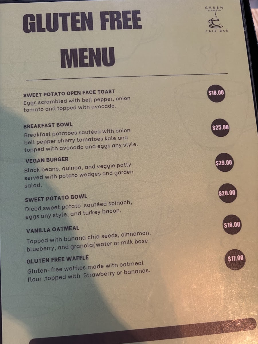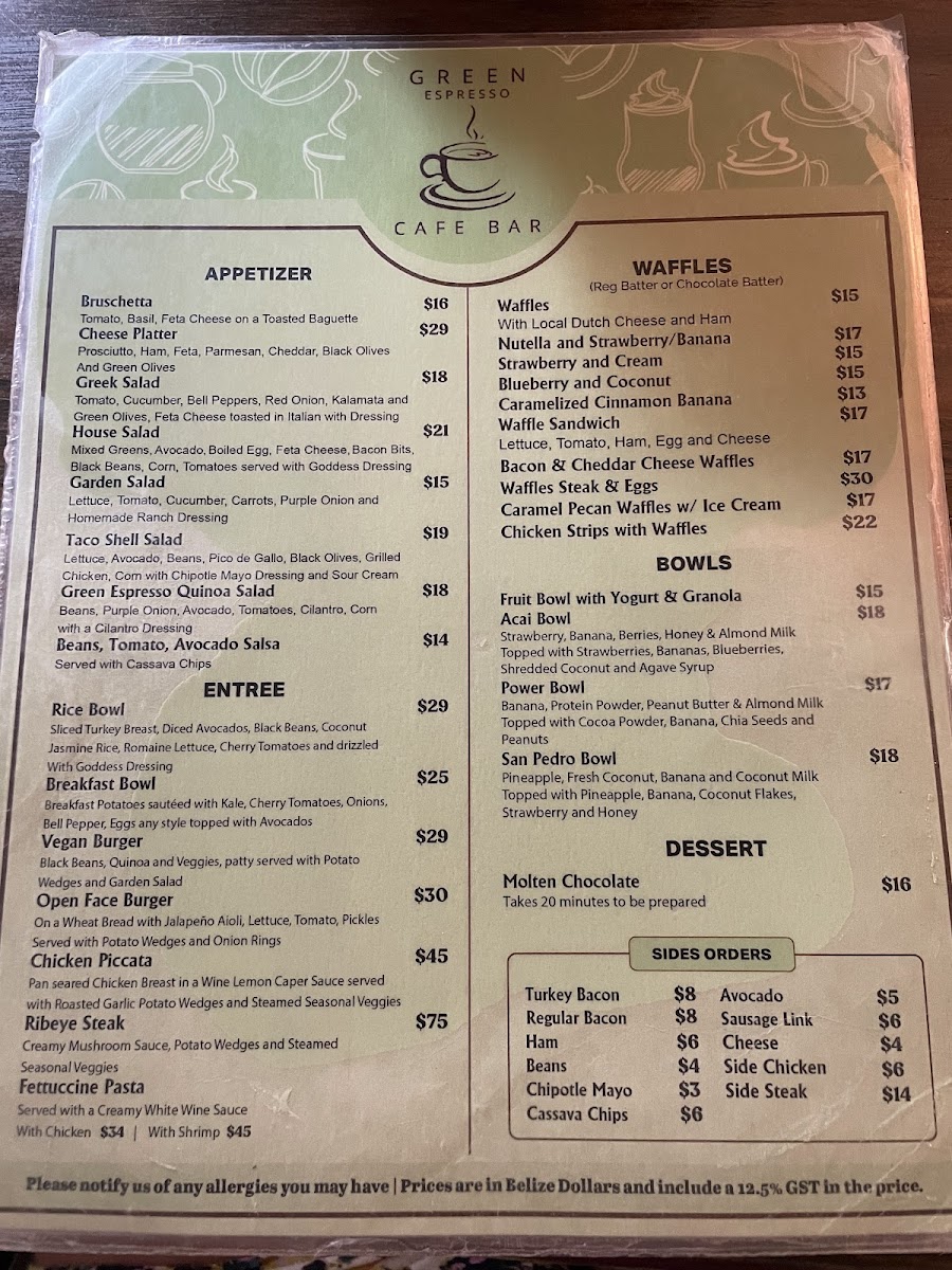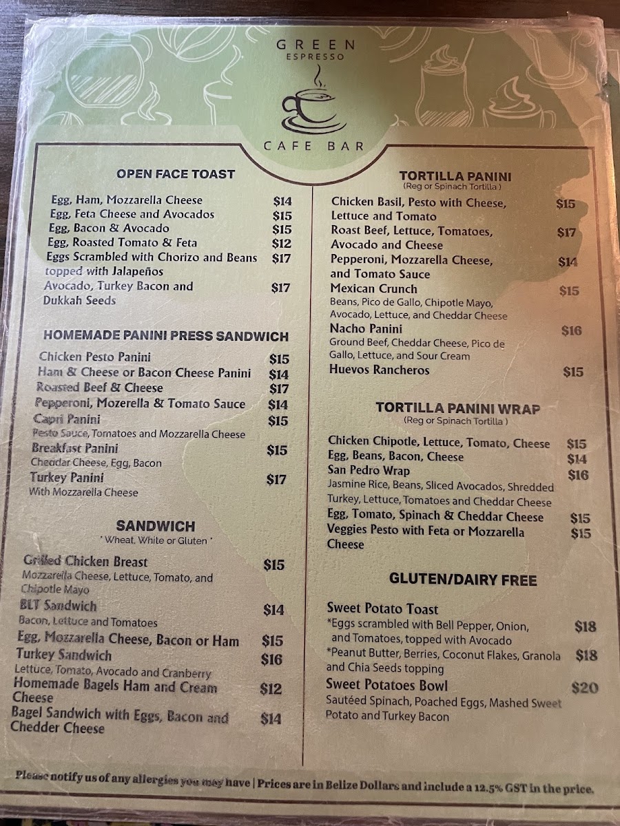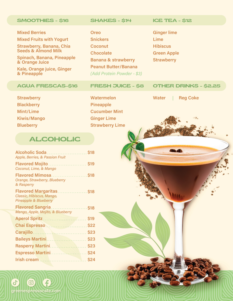 Green Espresso Cafe Bar offers a diverse and flavorful menu that caters to various tastes. For starters, you can enjoy Bruschetta or Spring Rolls, or dive into the tangy Sopa de Lima and Nachos. Their hearty entrees include the Crispy Chicken Burger and Beef Burger, as well as satisfying dishes like Ribeye Rice Bowl and Garlic Shrimp. For something more indulgent, try the Short Ribs. The menu also features an array of Tortilla Panini, such as the Pepperoni, Mozzarella Cheese & Tomato Sauce or the fresh Breakfast Tortilla Panini. If you prefer wraps, there are delicious options like the Chicken Basil Pesto or the flavorful Veggie Pesto with Feta Cheese. The open face toasts offer unique combinations, including Scrambled Eggs with Ham and Avocado and Spicy Pixpac Open Face with Avocado & Bacon Bits. For a sweet treat, the Caramelized Cinnamon Banana Waffles or the Blueberry and Coconut Waffle are excellent choices. The Homemade Panini Bread sandwiches, like the Ham & Cheese or Breakfast Panini, offer a satisfying meal. For lighter bites, enjoy a Tropical Mango Bowl or the refreshing Acai Berry Bowl. Don’t miss the indulgent Molten Chocolate for dessert. When it comes to drinks, the cafe serves a variety of Smoothies, like the Mixed Berries or the tropical Spinach, Banana, Pineapple & Orange Juice, alongside creamy Shakes such as Oreo and Snickers. There’s also a great selection of fresh juices, agua frescas, and refreshing Ice Tea options. Whether you’re in the mood for a chilled drink or a hot Cappuccino, Green Espresso Cafe Bar offers a perfect pick-me-up for any time of day. For those looking for a bit of excitement, the Flavored Mojitos or Flavored Margaritas are a great way to unwind.